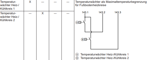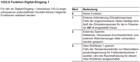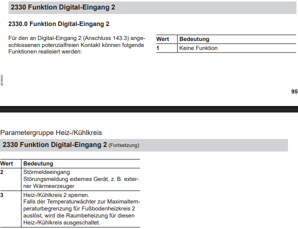 Das wäre dann also Funktion 2330 Digitaleingang 2 Wert 3, um die Pumpe an Heizkreis 2 (bei mir FBH) zu deaktivieren, bis die Temperatur unter den eingestellten Wert am Thermostat sinkt? Klingt auch nicht so, als würde die Anlage dabei auf Störung gehen. Ich versuch das mal mit meinem Heizungsbauer zu besprechen.